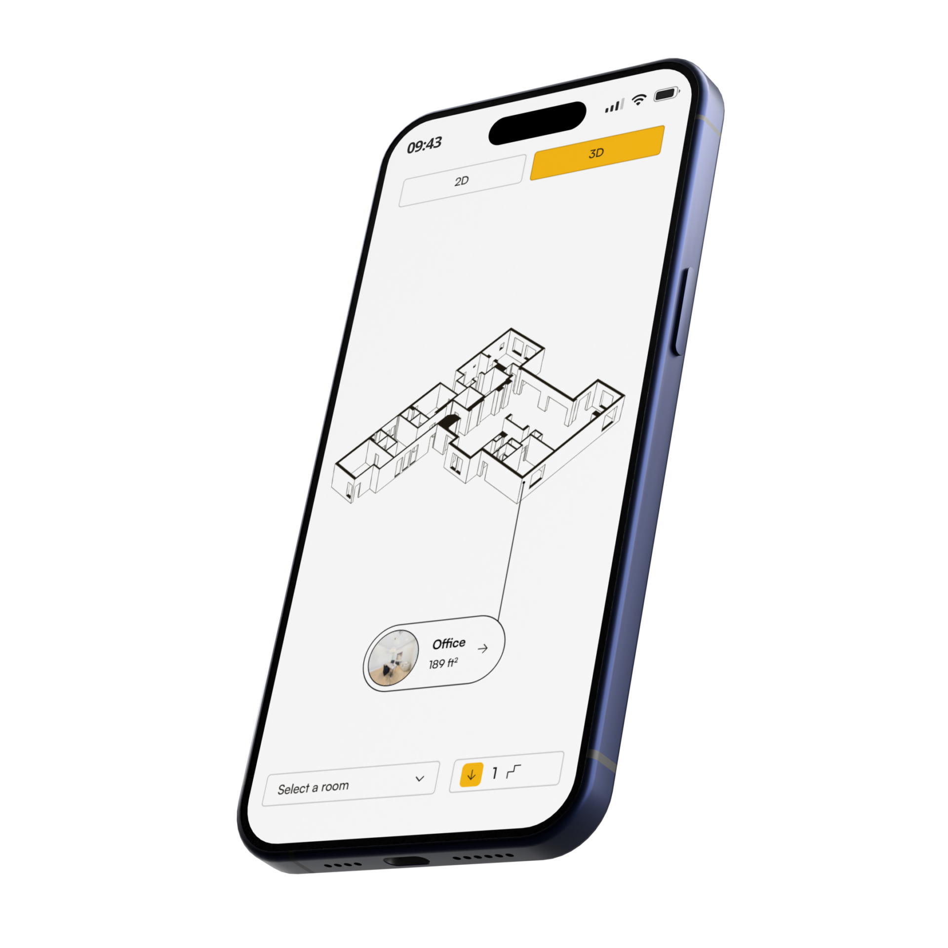Toggle 2D ↔ 3D, rotate to inspect layout, select rooms and floors, and jump straight into the virtual tour from any room.