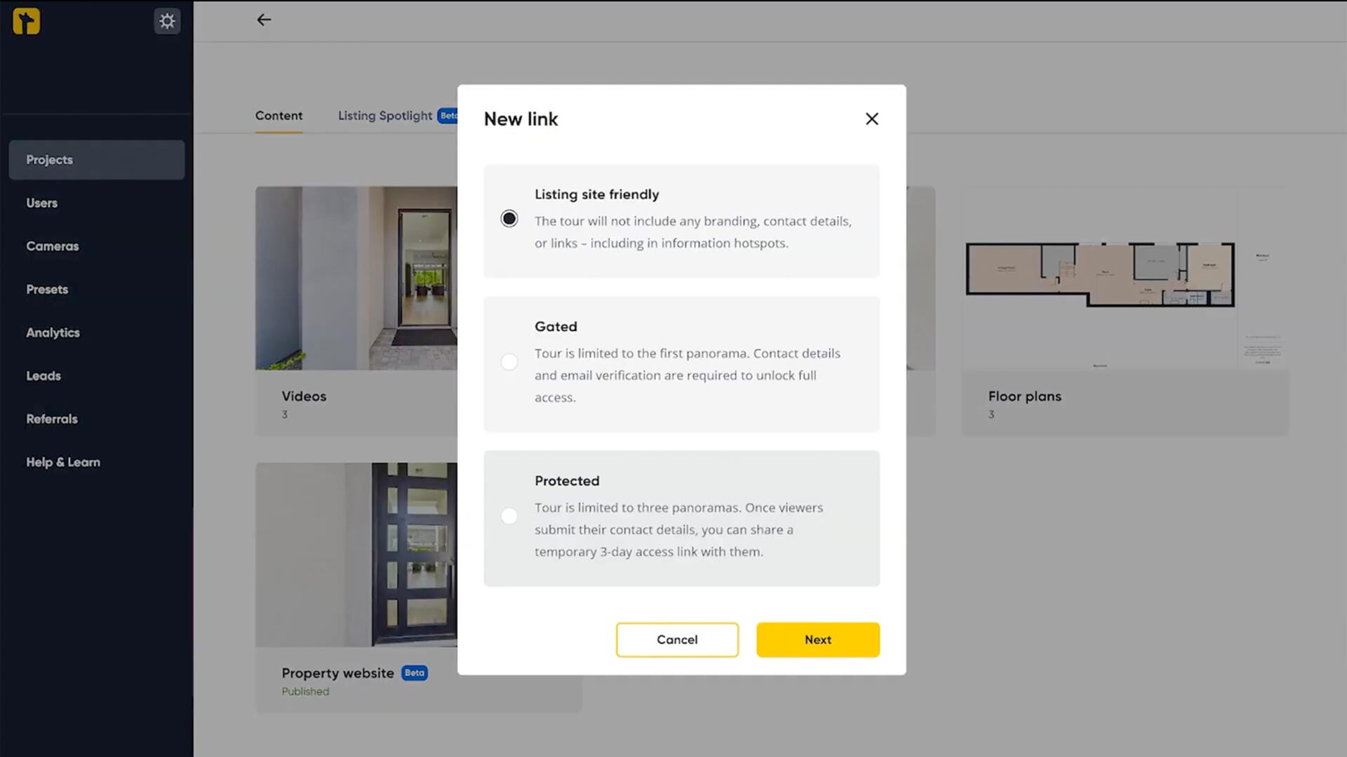 Tours now live inside the 3D floor plan environment. Jump from plan to room and back in one click. It’s a single spatial experience, not separate tools stitched together.
